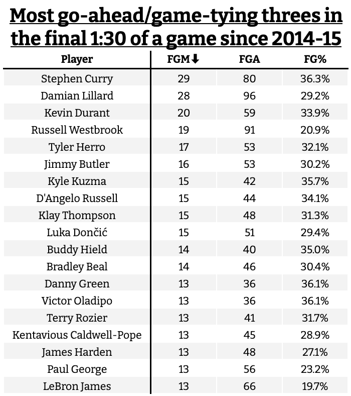 数据网站统计,自2014-15赛季以来,最后1分30秒的追平&反超三分,库里已经轰进第29记,超越利拉德,独占第一。