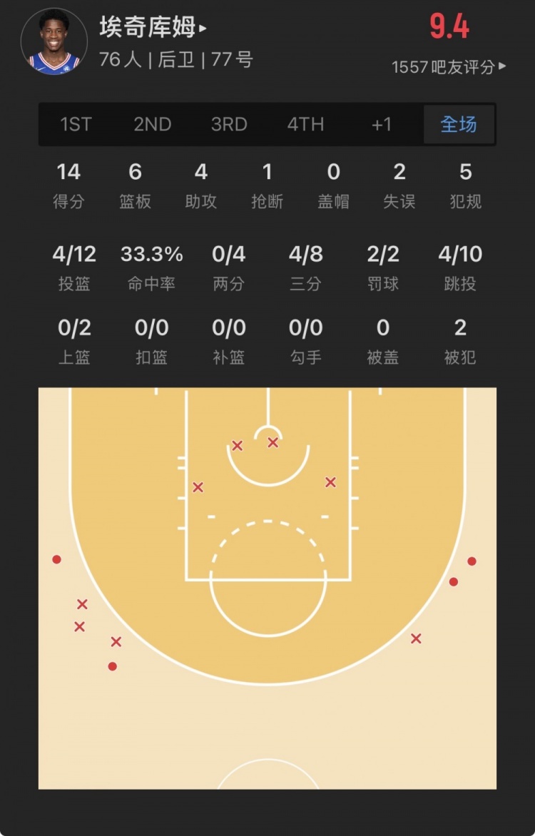 76人探花秀 VJ-埃奇库姆 登场40.0分钟