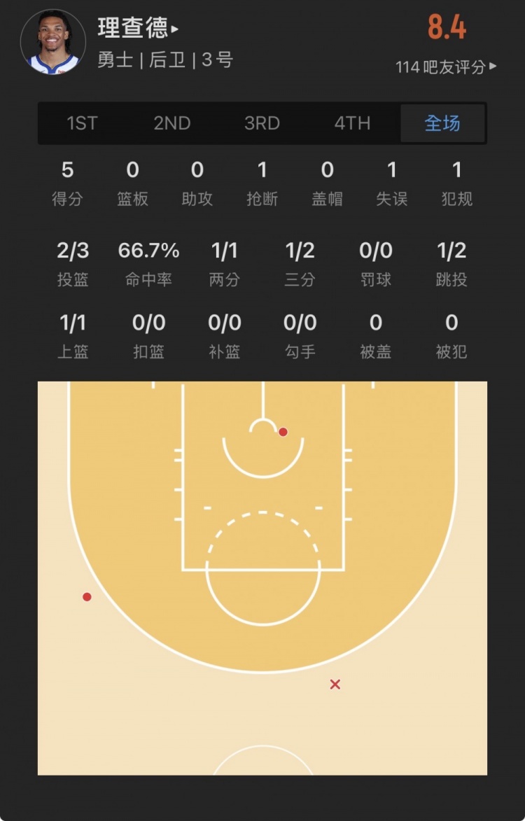 勇士56号秀 威尔-理查德 登场6.3分钟