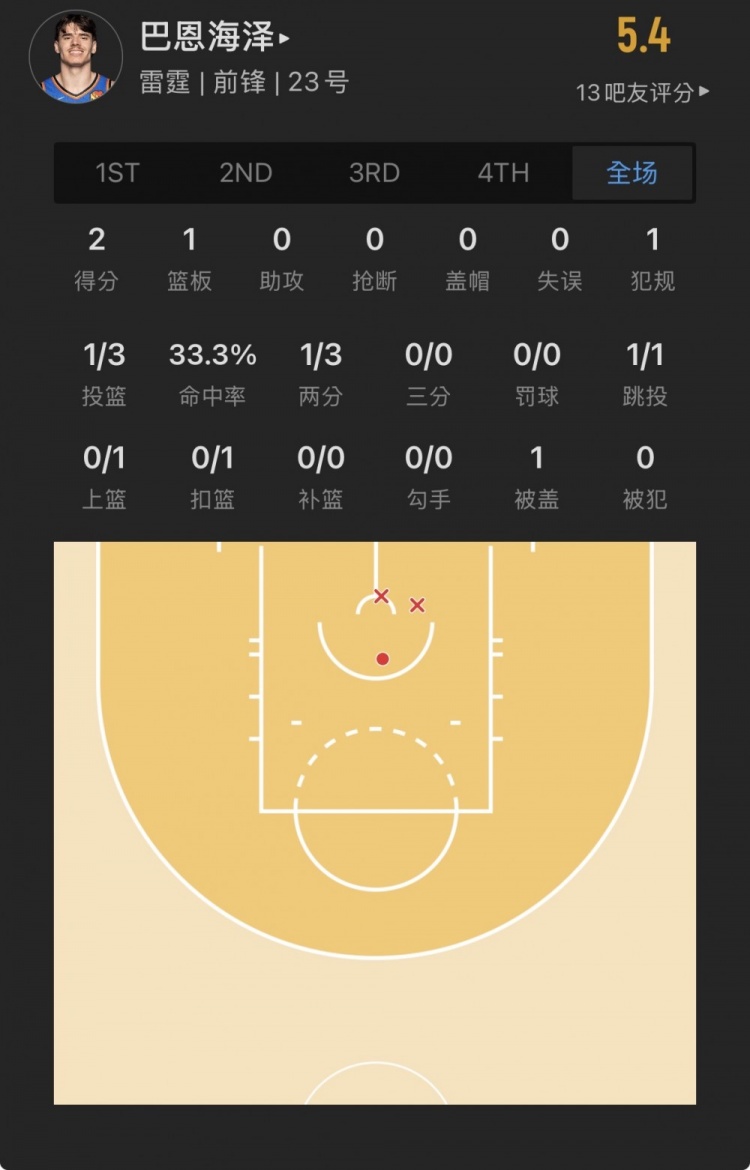 雷霆44号秀 布鲁克斯-巴恩海泽 登场6.9分钟