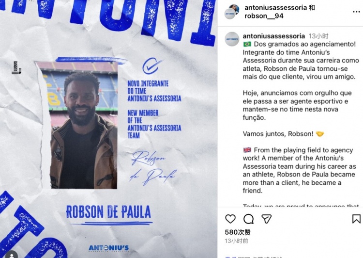 直播吧10月31日讯经纪公司Antoniu’s Assessoria今日官方宣布,前大连英博外援罗伯森加盟,成为该公司旗下经纪人。