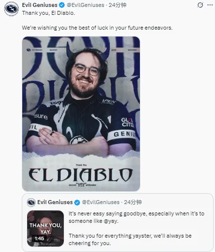 虎扑10月30日讯 EG发布人员变动公告:yay正式离队