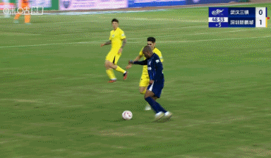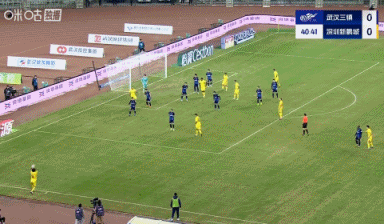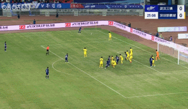伤停补时5分钟。上半场比赛结束,武汉三镇0-1深圳新鹏城。