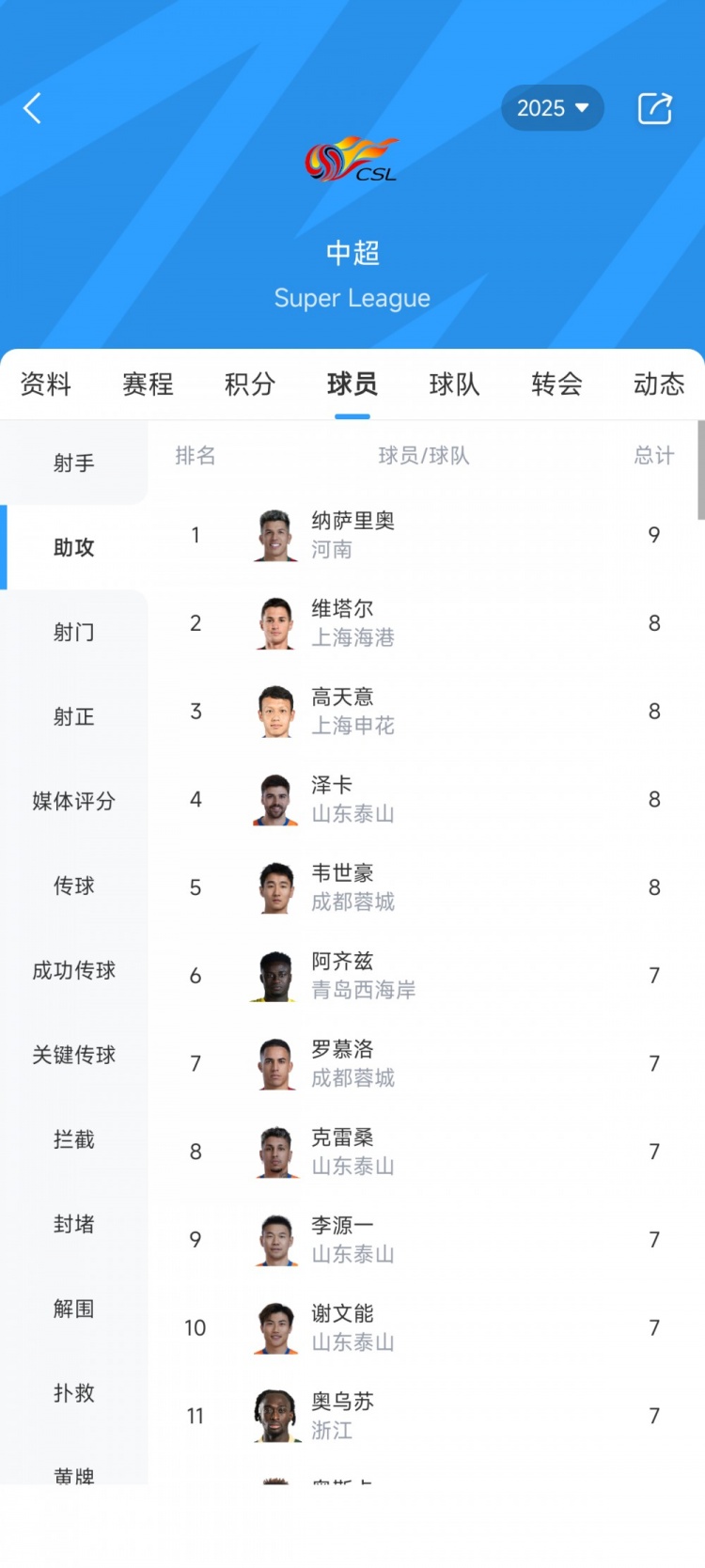目前中超助攻榜↓