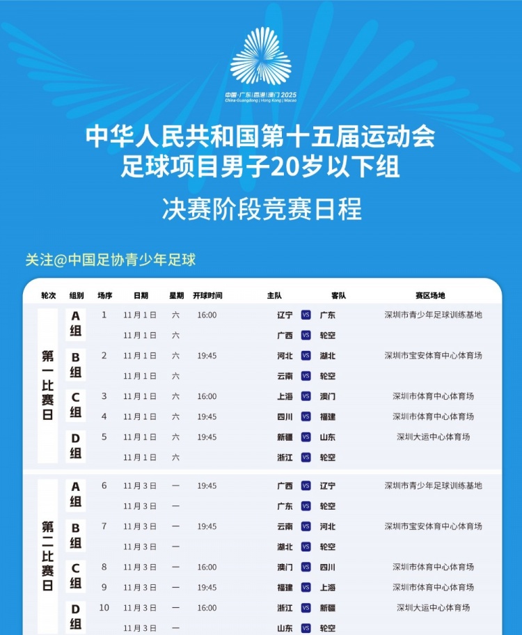 中华人民共和国第十五届运动会足球项目男子20岁以下组决赛阶段竞赛日程