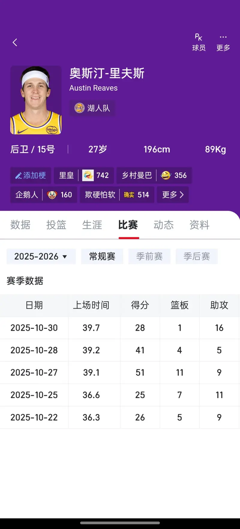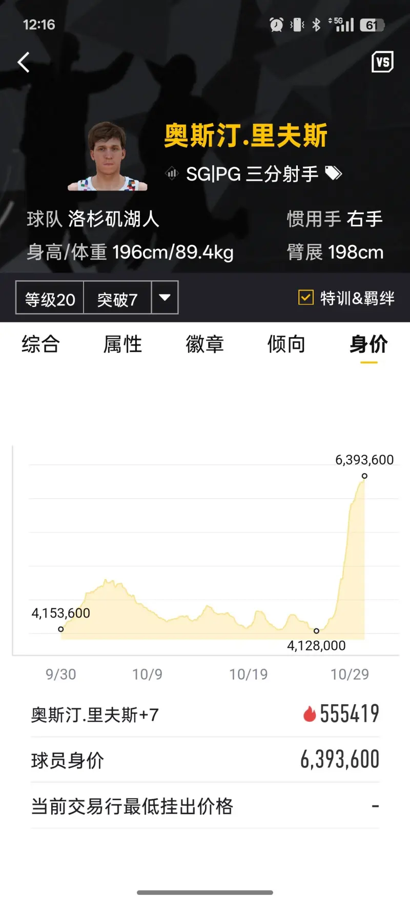 最近5场比赛里夫斯天神下凡搬的表现游戏身价也是水涨船高,目前拉满身价已突破700万大关,还在持续断卡,800万指日可待,10月13号我发了一个帖子说没人炒里夫斯,当时里夫斯才400多万,现在想抄底已错过最佳机会,按照目前表现下次数据更新可能会史诗级大加强,目前游戏中里夫斯最大的问题是投射很不稳定,如果更新得到进入节奏关键徽章,到时候就是下一个布伦森,毫不夸张。但是突破千万身价有点难,队里有东契奇和詹姆斯两个大哥,后续比赛回归里夫斯的出手机会绝对会减少很多,而且游戏里里夫斯拉满评分已有108,如果大加强评分也会加不少,到时候如果拉满114或116的评分反而会抑制身价,现在八百万身价可以考虑抛出,小赚2百万合同费,没入手的也不建议入手了,风险太高。