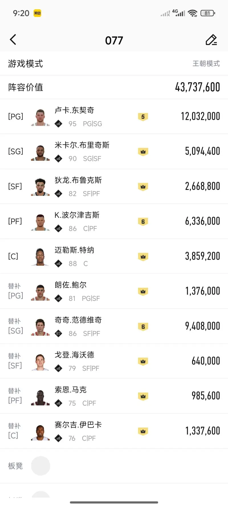 波尔吉尼斯没买还,奇奇范德维奇也还没买,主要是打五外跑战术,主力打两节半,替补一节半。我感觉我四号位问题挺大的,有没有大佬帮忙支支招哇