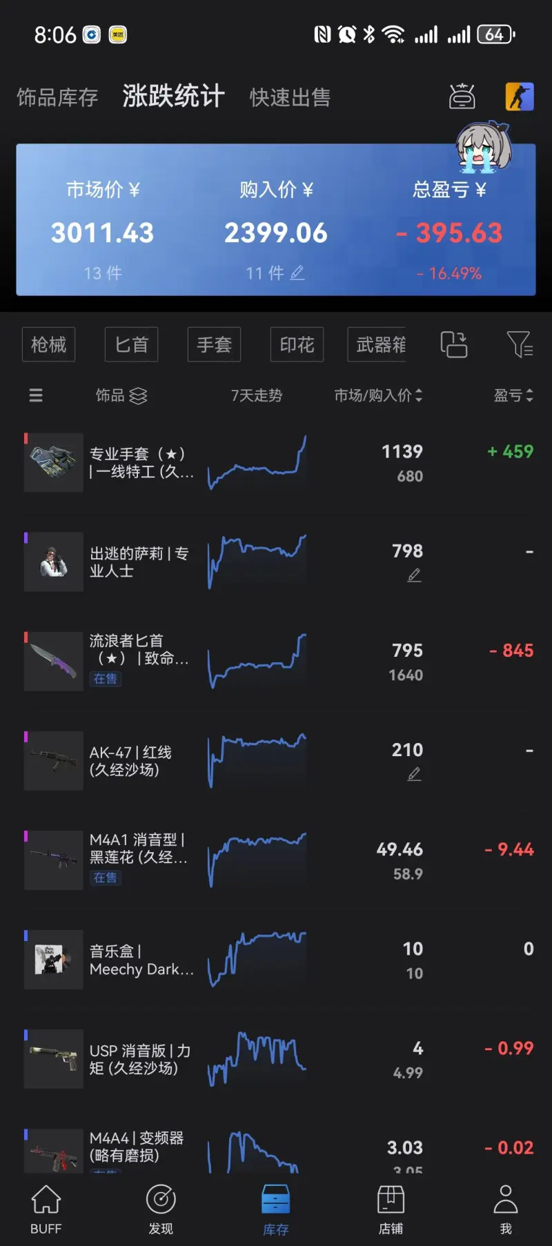之前1600多买了个刀,然后前两天抄底了个手套,一来一回快抵消我的亏损了,现在唯一担心的就是会不会被撤回