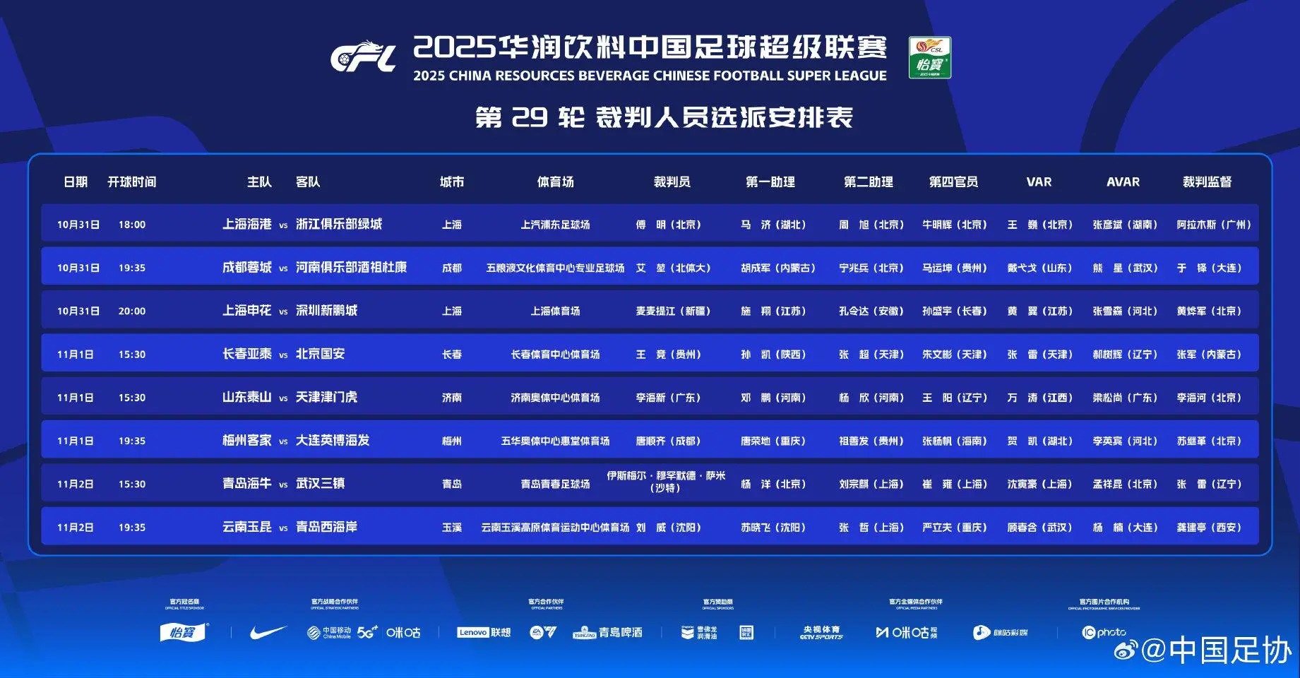 虎扑10月31日讯 中超联赛第29轮裁判人选公布,本轮比赛将于今日开始。