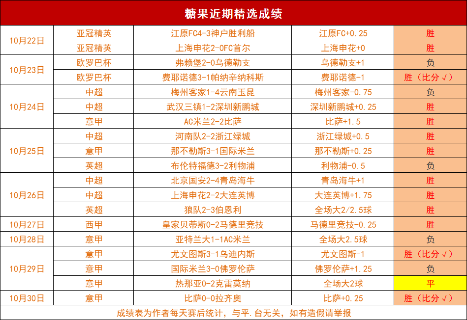 战绩回顾:昨天精选的意甲告捷!近期精选19失5!今天赛事依旧不错,精选带来一场中超焦点战,继续胜起来!欢迎大家打赏或包周支持,我们按计划稳定取胜!