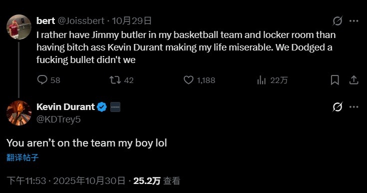 对此杜兰特回复:你都不在队里啊兄弟,哈哈哈。