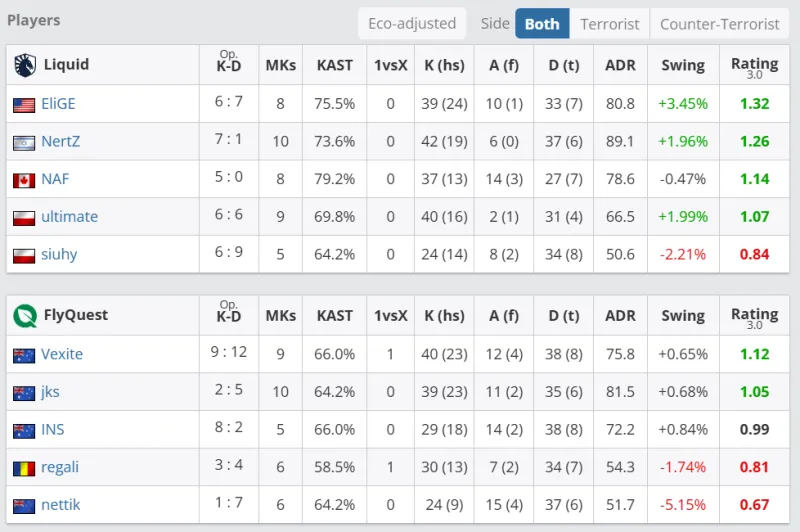 图二Train 尽管FlyQuest的Vexite拿到1.38rating 但Liquid全队稳定发挥,EliGE更是拿到1.46rating 稳定的发挥让Liquid以13-10战胜FlyQuest进入下一阶段