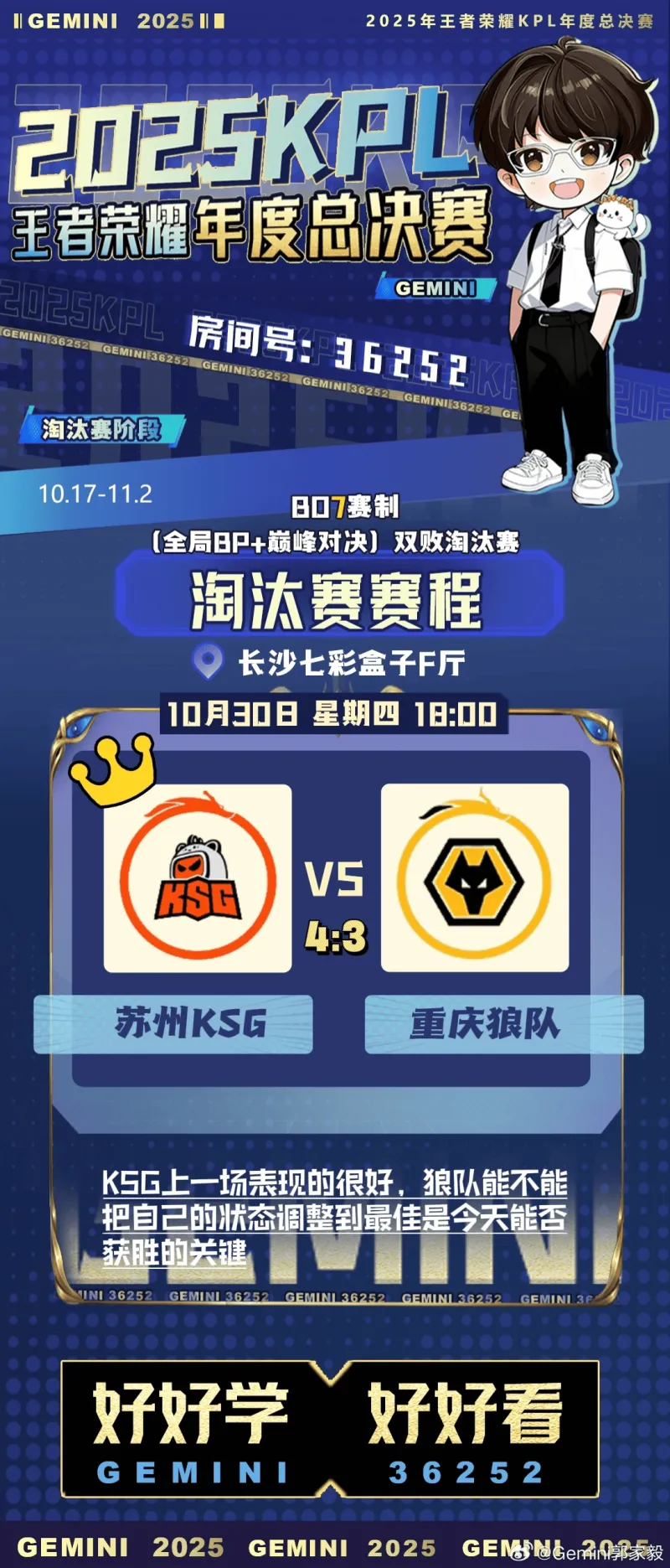 虎扑10月30日讯 Gemini预测今日赛事:KSG巅峰对决淘汰狼队,今天不可能零封,原文如下: