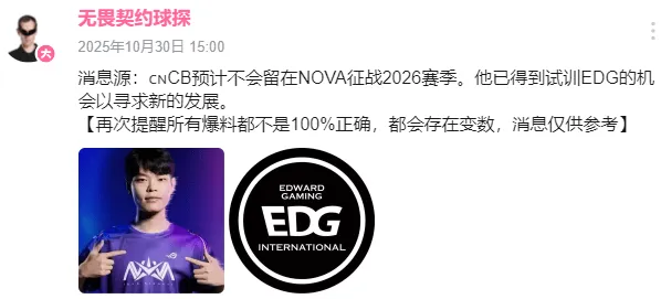"消息源:CB预计不会留在NOVA征战2026赛季。他已得到试训EDG的机会以寻求新的发展。
