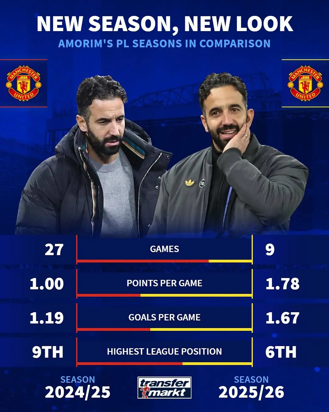 虎扑10月30日讯 德国转会市场对比了阿莫林执教曼联本赛季和上赛季的英超数据,列前的为上赛季数据。