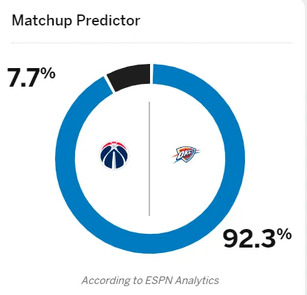 赛前,美媒ESPN对本场比赛进行了预测,雷霆胜率高达92.3%,奇才胜率仅为7.7%。