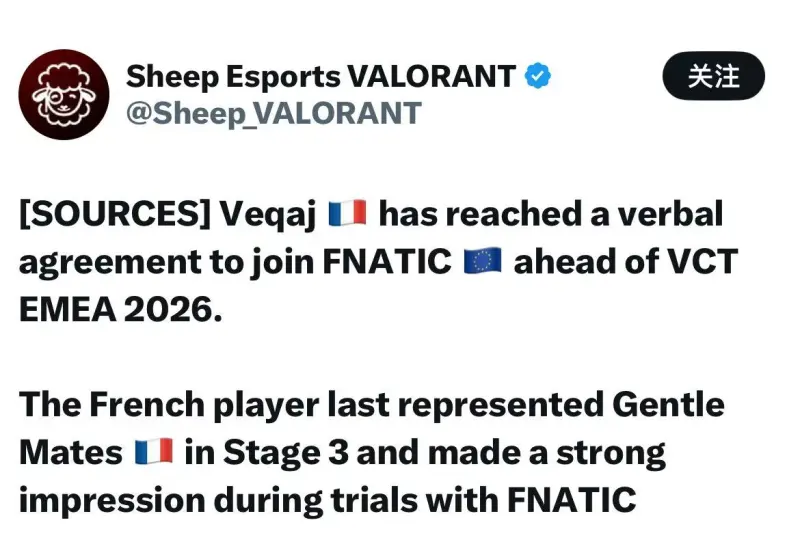虎扑10月30日讯 据外媒报道,法国选手Veqaj已与FNATIC达成口头加盟协议,预计将随队征战2026赛季VCT EMEA联赛。Veqaj在2025年5月加盟EMEA赛区M8(Gentle Mates)在队内担任信息先锋位,并在第二赛段代表战队出战。报道指出,他在此前为FNC进行的试训中表现出色,从而获得队伍青睐。