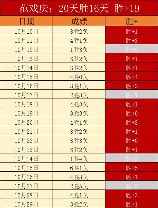 连胜2天10胜7,近20天胜16天,合计胜+19,胜+表现尤其突出。9月15日打出10连胜,17连胜记录也是在近期出现的,大胜是频繁出现的高超实力。