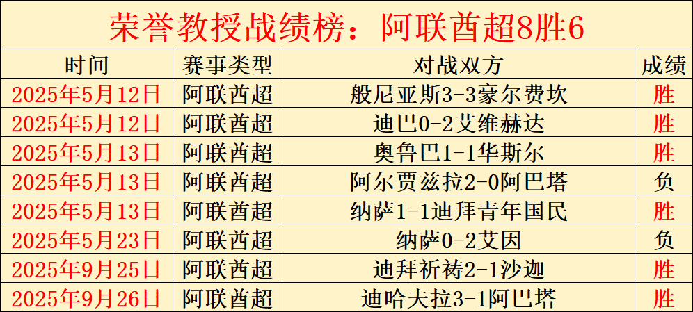 阿联酋超8胜6,最高打下14连胜的表现已见证实力。今天继续奉上强项赛事系列,各线赛事都能保证清晰的解读思路与靠谱的选择方向!截至昨天荣誉教授已经有4156场解读经验,今天继续精选5场,多元化的赛事系列,以更高连胜胜利率绩迎接5000场记录来临,关注荣誉教授,成为荣誉教授的好伙伴!
