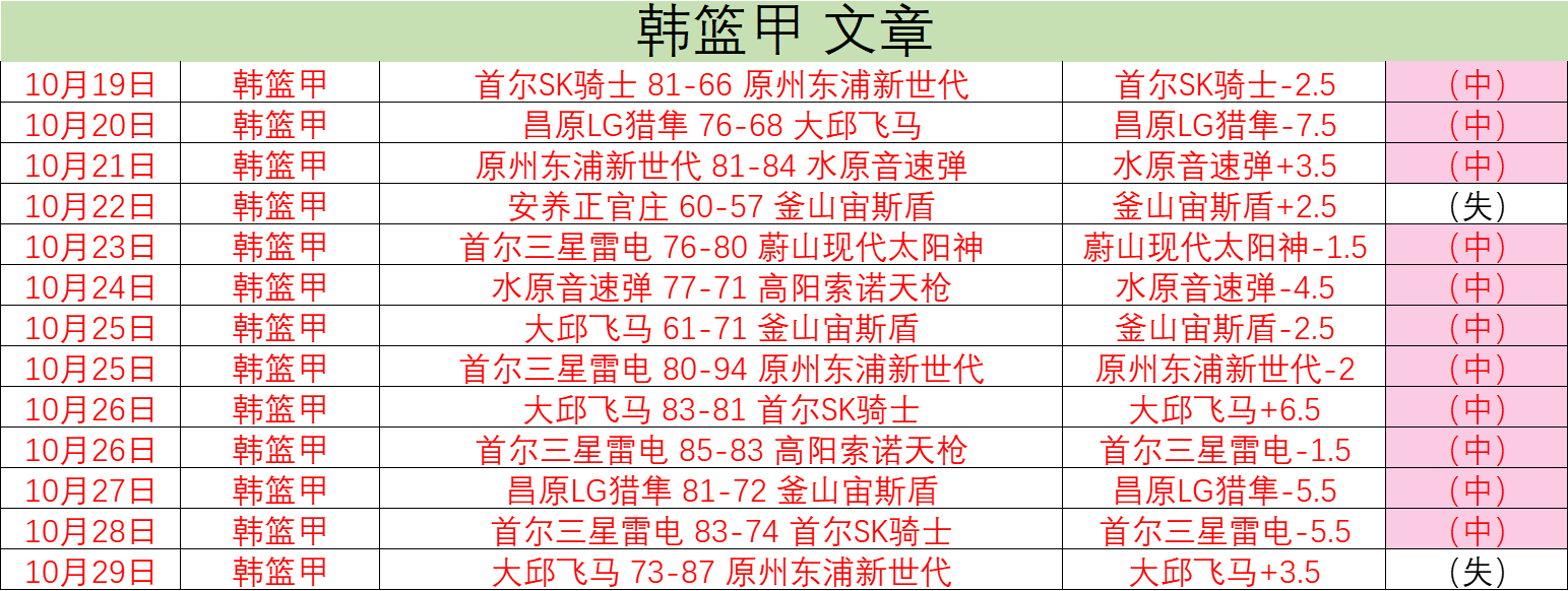 水原音速弹上赛季是33胜21负,进攻端74,防守端73,季后赛是水原音速弹3-2大邱飞马,但半决赛,首尔SK骑士3-1水原音速弹,无缘总决赛。近期赛事,水原音速弹87-92 [38-50]安养正官,其他的水原音速弹68-72 [33-41]安养正官,高阳索诺天60-68 [23-38]水原音速弹,原州东浦新世代69-85 [39-49]水原音速弹,信州勇士77-85 [43-40]水原音速弹,水原音速弹93-93 [47-52]大邱飞马,水原音速弹104-80 [58-34]菲律宾大学格斗马鲁。一起看看一起分析。新赛季目前常规赛,蔚山现代太阳神4胜5负,水原音速弹6胜3负。